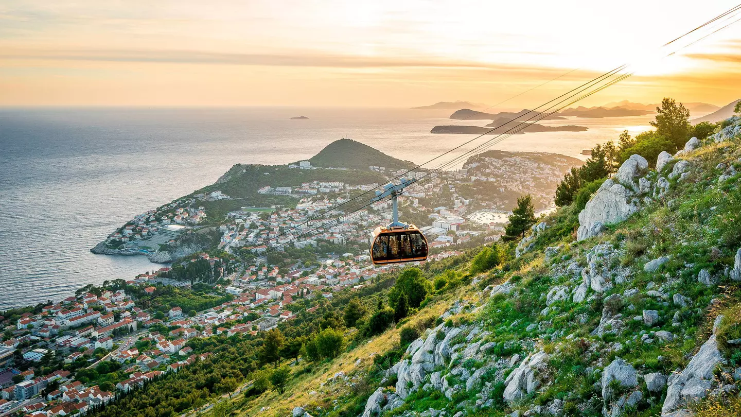 Dubrovnik's cable car traveling up Mt Srđ at sunset. Samantha Ohlsen/Alamy Stock Photo