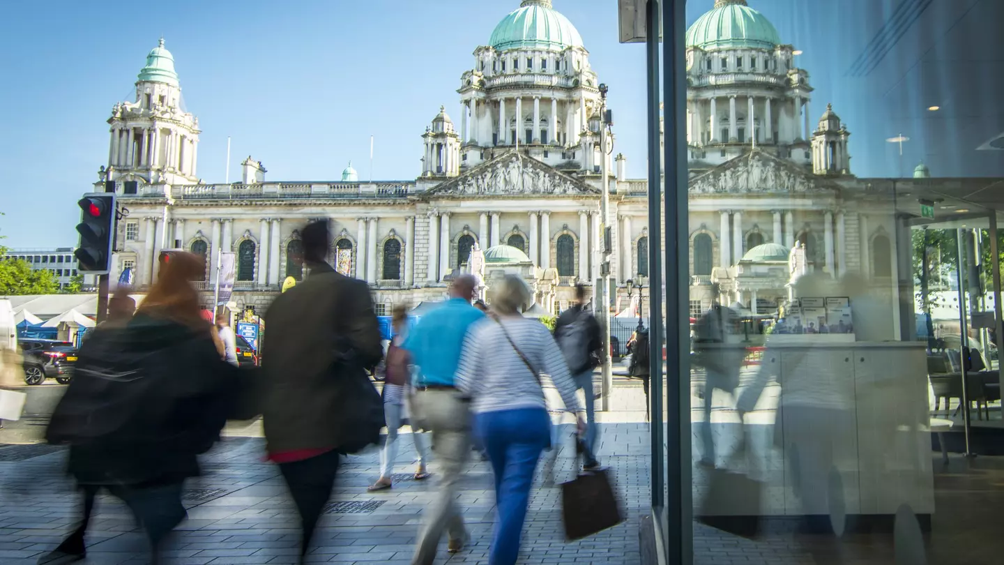 Motion blurred shoppers in front of Belfast city hall in Northern Ireland. William Barton / Getty Images