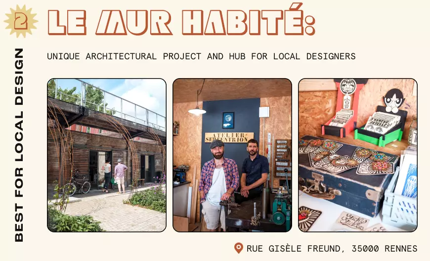 A bit outside the city center you'll find a unique architectural project and hub for local designers: Le mur habité. Built alongside a rail line, this building with soundproof walls of wood and glass is a testament to the thriving craftsmanship scene of Rennes. Le mur habité is now a creative nucleus where artists, designers and artisans celebrate the essence of Breton crafts and innovation.