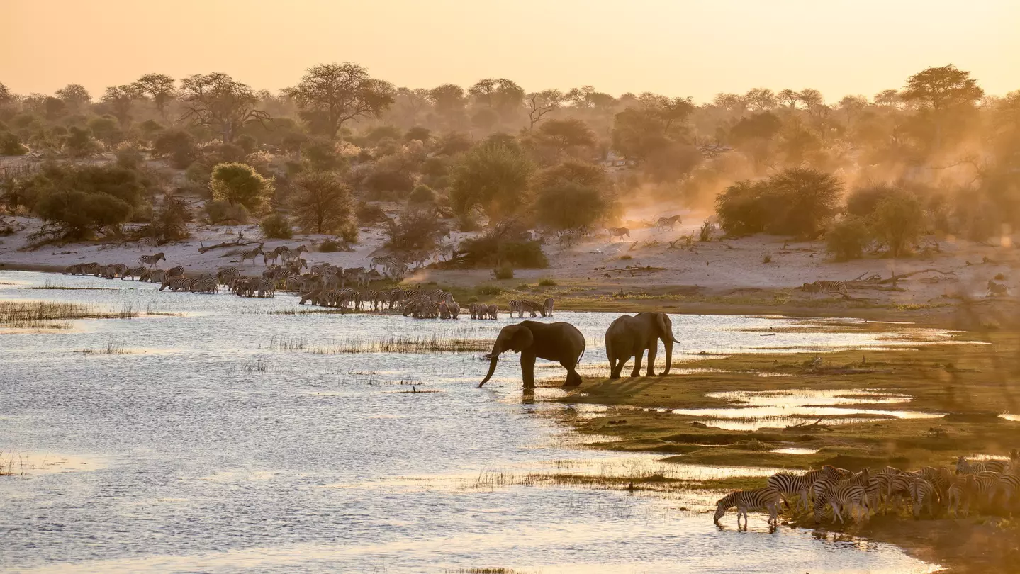 Elephants and zebras at the river in Makgadikgadi Pans National Park, Botswana. Beata Whitehead/Getty Images