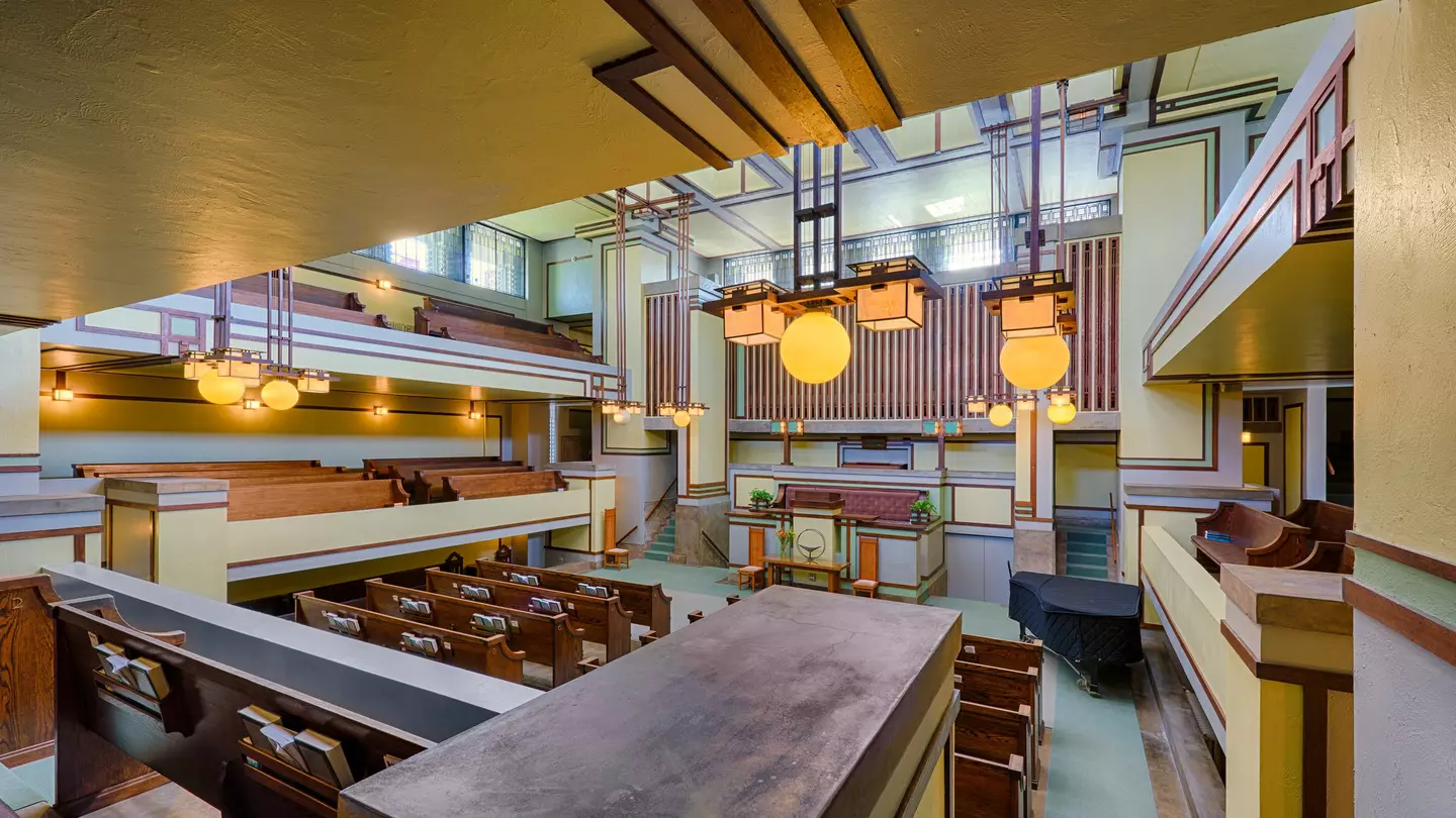 The interior of Frank Lloyd Wright’s Unity Temple, Oak Park, Illinois. Nagel Photography/Shutterstock