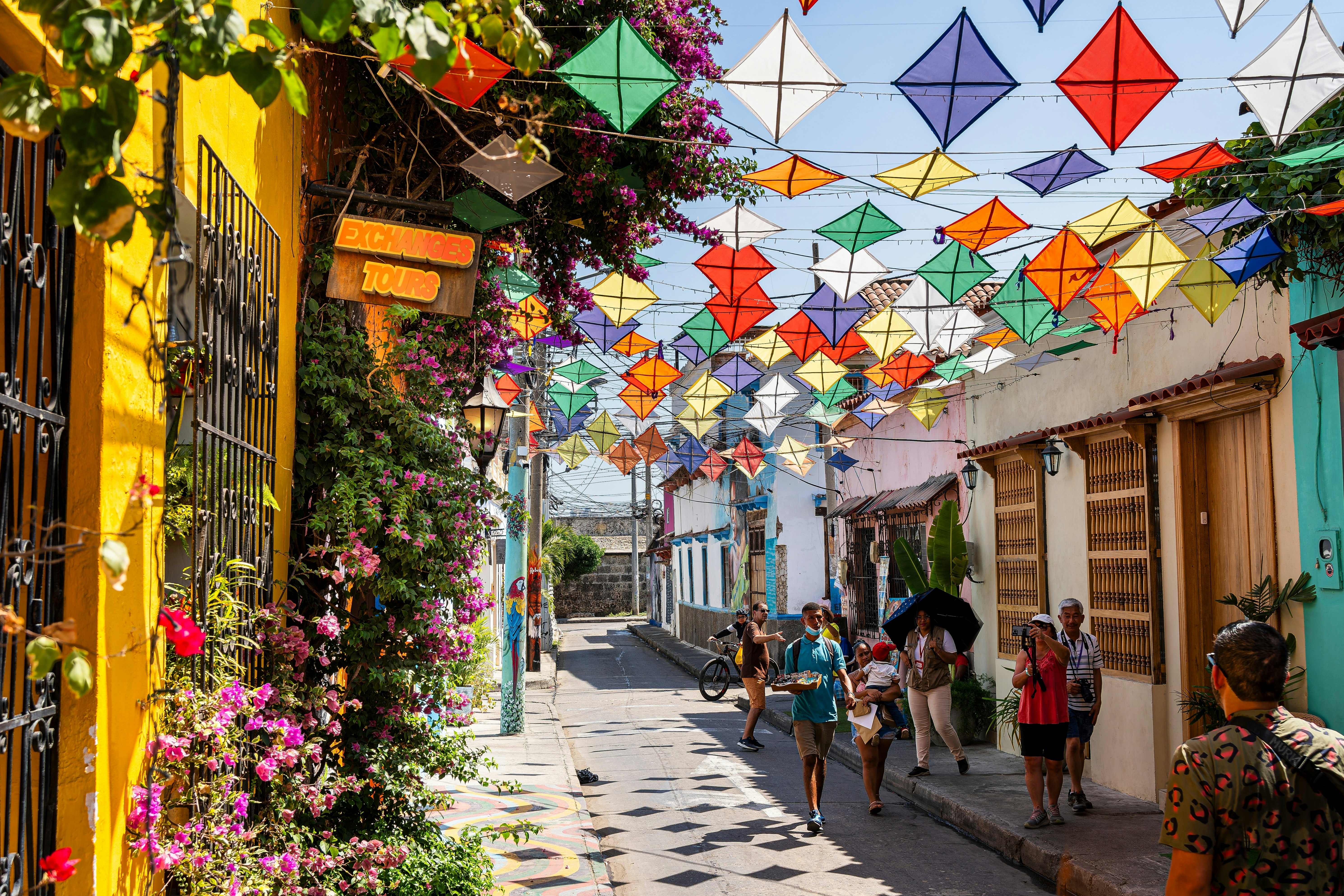 Just east of the Old Town’s Torre del Reloj, neighboring Getsemaní is just as walkable. Traditionally an enclave of the working class, the barrio has in recent years transformed into a trendy district full of boutique hotels, restaurants and cafes. At every turn, the streets and narrow alleyways unveil colorful murals or flags, kites, umbrellas and lights strung overhead.