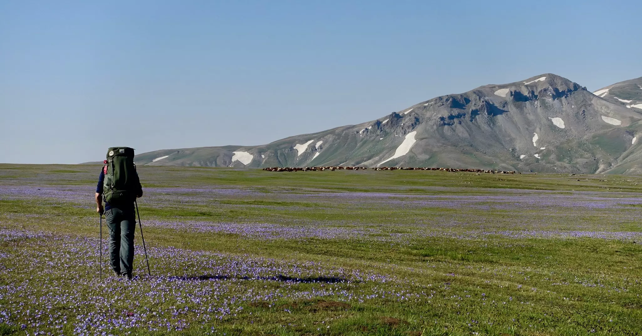 This trail requires a lot of preparation. It should only be hiked between June and September, as outside of this season snow makes parts of the trail inaccessible. (Even when I hiked in August, some snow lingered in the Gegham Mountains.) Yet while the warm summer months clear the trails for hiking, the season brings challenges: in July and August temperatures along much of the route soar to more than 32°C (90°F). Since water is scarce, you’ll need bottles with a few liters’ capacity, as well as a filter-purifier to refill them. To hike the full Armenian section of the TCT you’ll need to allow for around six weeks, hiking almost 20 km per day. If you’d prefer to take it at a more leisurely speed, factor in two months. Fastpackers and trail runners can cover the ground in significantly less time.