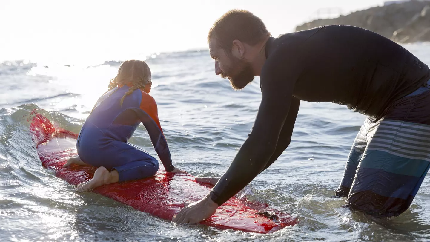 The learning curve may be steep, so soak in the moment: dolphins cresting in the distance, pelicans skimming the surface, and your kids paddling hard for a wave.