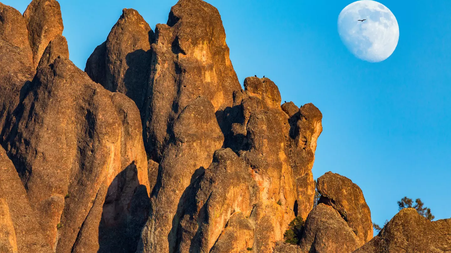 A condor flies in front of the moon at Pinnacles National Park, California. NickLustPhotography / Getty Images