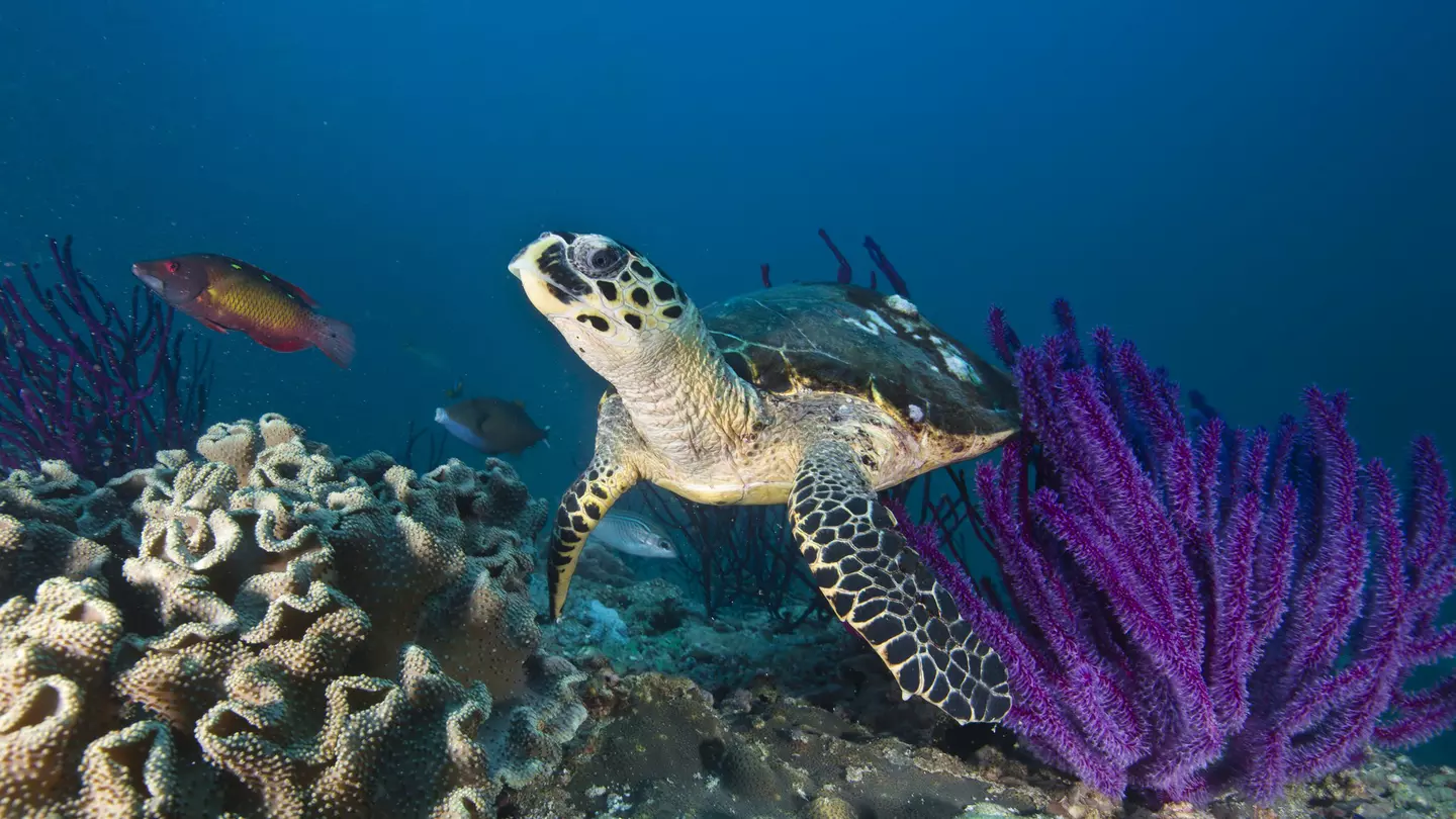 A hawksbill sea turtle paddles through purple whip coral. Liquid_Light / Getty Images
