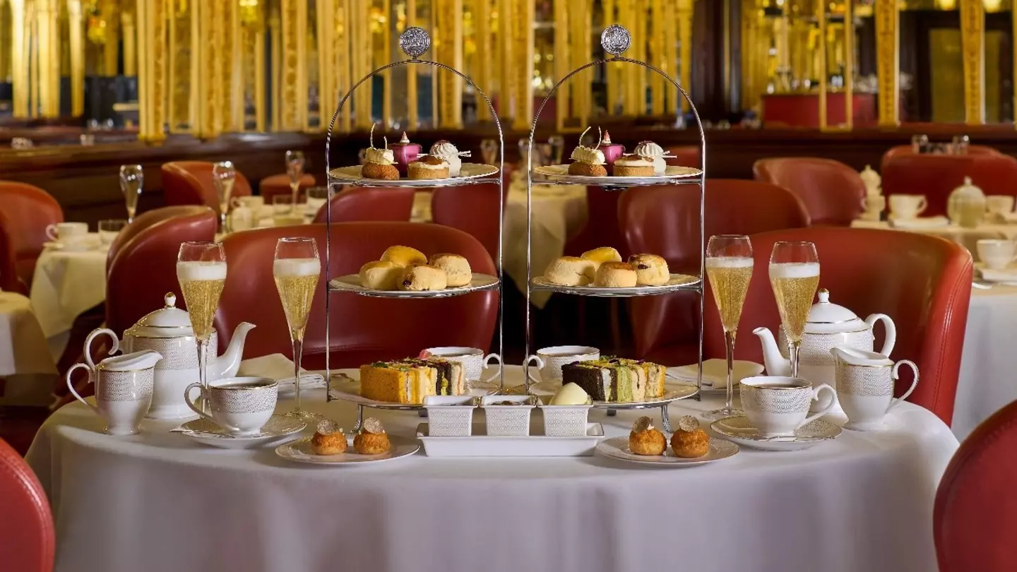 Afternoon tea with glasses of Champagne in a gilded London restaurant.