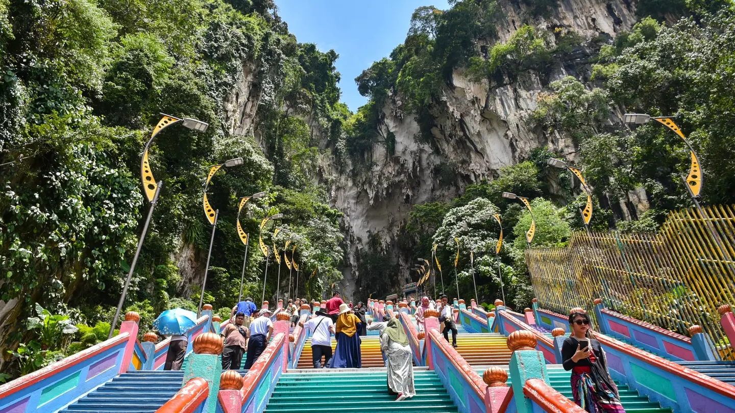 Sheer limestone cliffs rise above you. Ahead stretches a staircase of 272 steps. And looking you smack in the eye is an imperious gilded statue, the Hindu god Lord Murugan.